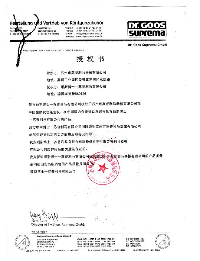 蘇州市蘇普利馬器械有限公司是專業從事醫用X射線防護系列用品、裝置、代理德國Dr.Goos-Suprema Gmbh.顧斯博士-蘇普利馬有限公司生產的原裝進口鉛衣及醫用觀片燈的生產銷售企業.生產的X射線防護圍裙均來自美國SHIELDING公司的最新型超薄型防護材料,,具有防護性能可靠、穿戴舒適、輕便柔軟、操作自如等諸多優點.產品均通過相關X射線檢測機構的檢測,達到產品標準的要求.X射線醫用膠片觀察燈。是采用全LFD燈光技術。具有重量輕,光源均勻,亮度高,無頻閃,不變型,使用壽命長等特點。均取得了生產許可及醫查看更多>>